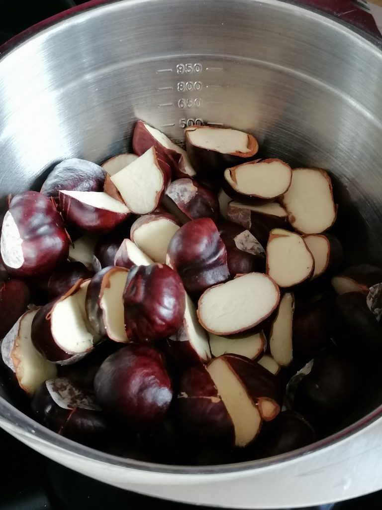 Fülle die Kastanien bis zum Rand in ein Glas und fülle das dann mit Öl (Olivenöl, Mandelöl, nimm was du hast) auf.