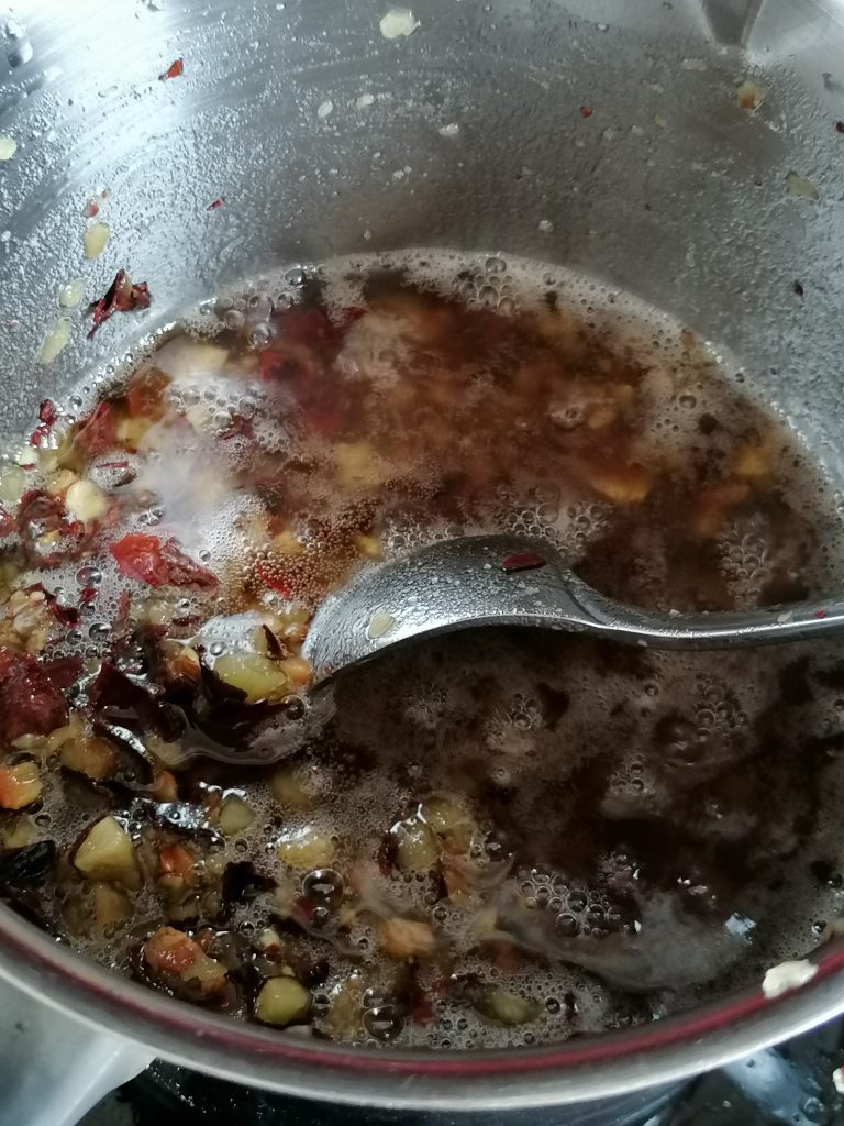 Anschließend gibst du alles in einen breiten Topf oder eine Pfanne mit hohem Rand und lässt es 2-3 Stunden bei niedriger Hitze ausziehen. Es darf zischen, aber nicht sprudeln. Schließlich wollen wir die Kastanien ja nicht frittieren. Wenn das den Geruch und ggf. eine gelbliche Farbe angenommen hat, ist es fertig. Filtere das noch warme aber nicht heiße Öl über einen Kaffeefilter ab. Decke das Öl ab und stelle es beiseite.