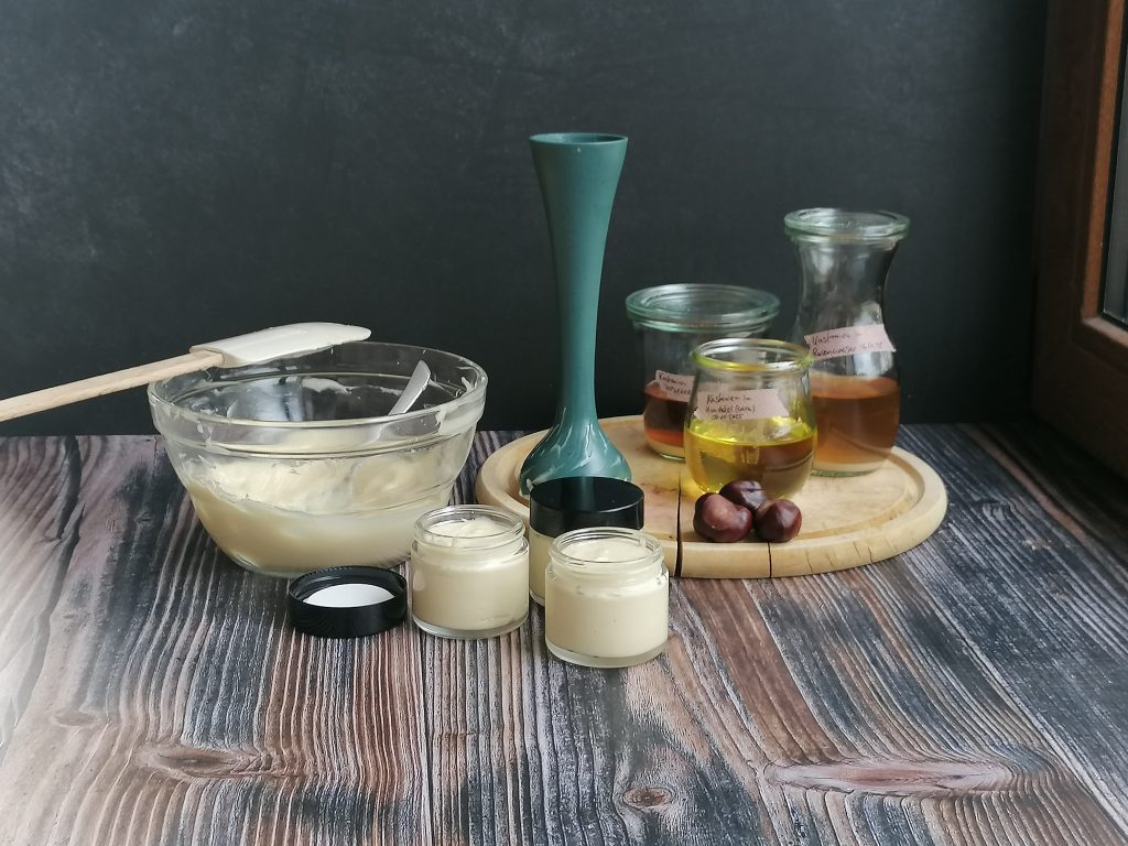 Kastanien, der Ölauszug, die Tinktur, das Rosenwasser und die fertige Creme